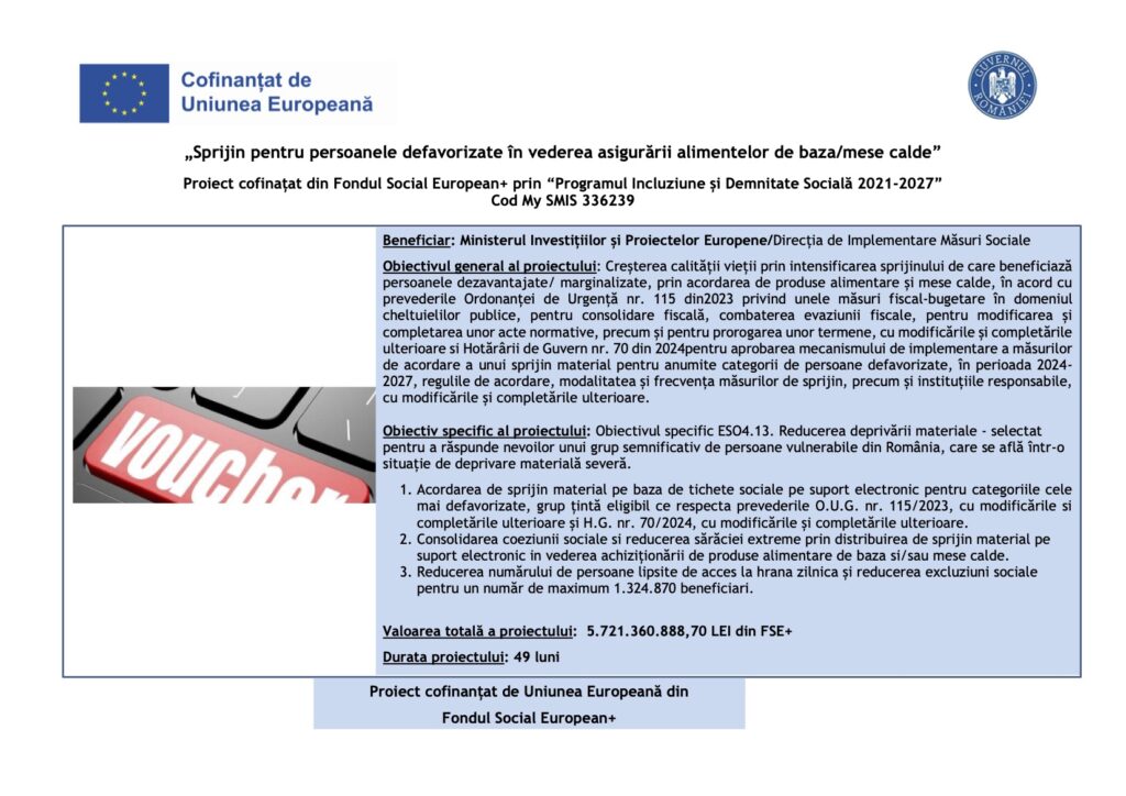 Proiect – „Sprijin pentru persoanele defavorizate în vederea asigurării alimentelor de baza/mese calde”